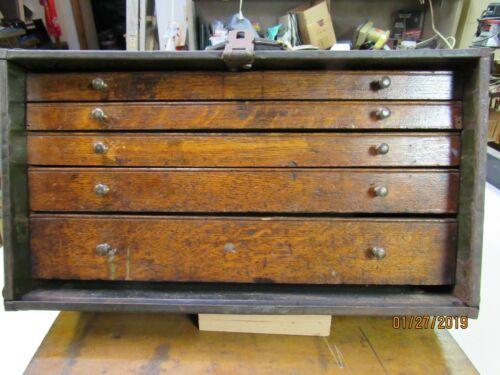 Title (ebay affiliate link): VINTAGE METAL WOOD MACHINIST TOOLBOX for PARTS ARMY GREEN 5 Drawer
