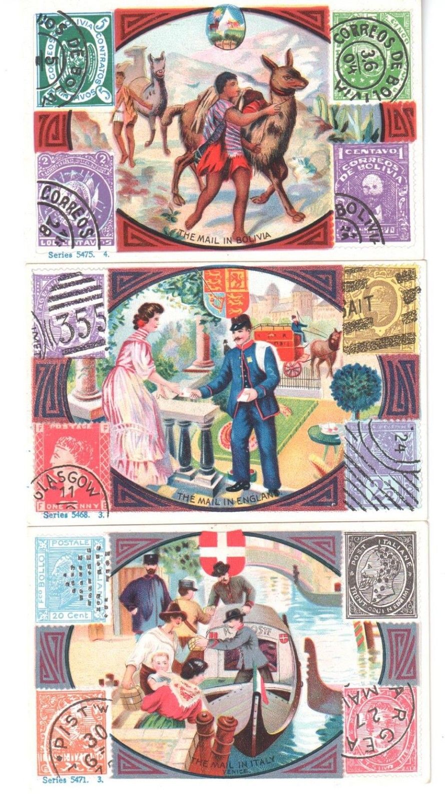 LOT: 3 VINTAGE TRADE CARDS PLAYER-PIANOS STAMPS MAIL IN ENGLAND, ITALY & BOLIVIA