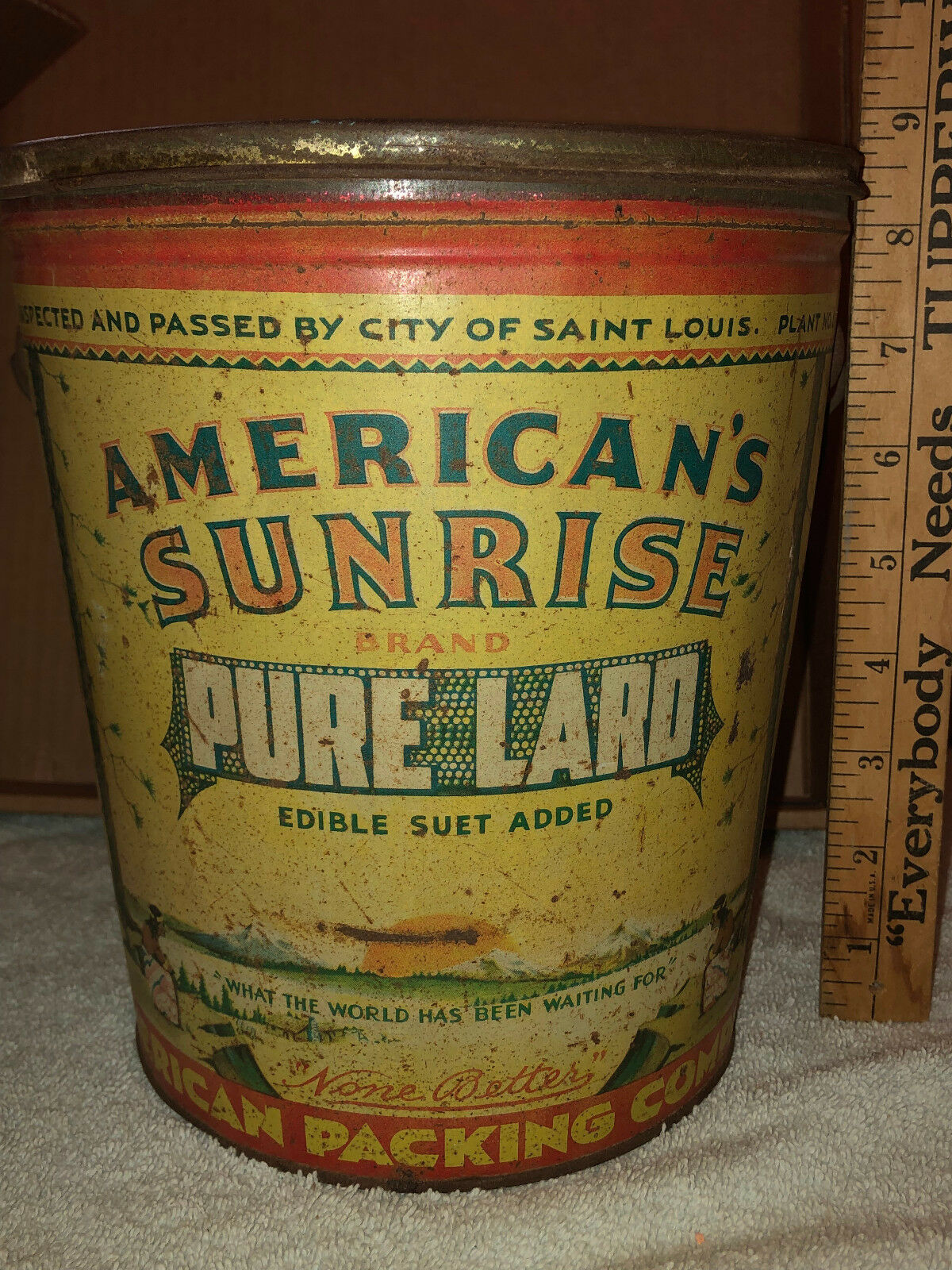 Title (ebay affiliate link): Vintage AMERICAN''S SUNRISE PURE LARD TIN 8 Pounds Net Weight Tin Can