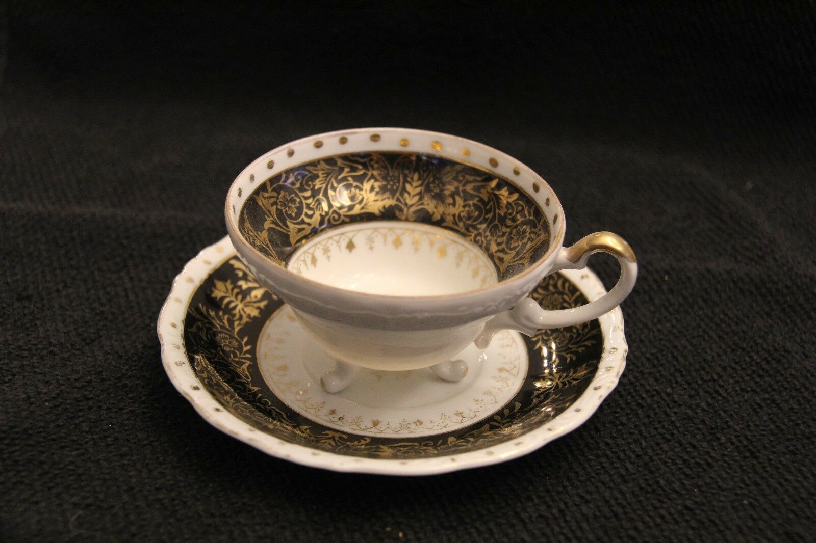 ANTIQUE BLACK AND GOLD CUP (3 FOOTED) WITH SAUCER UNKNOWN MAKER