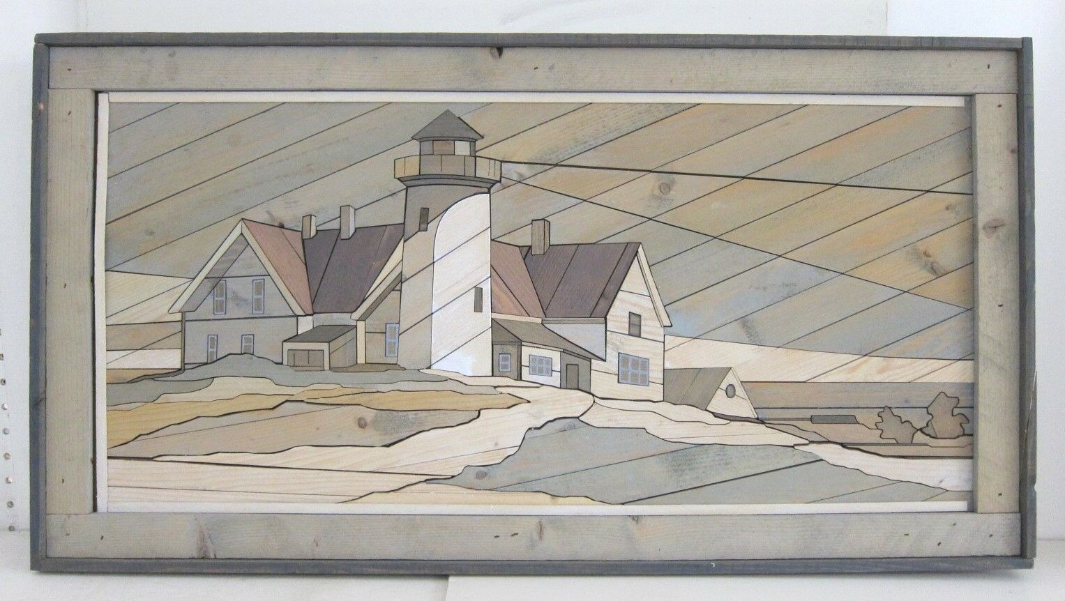Costal Lighthouse Scene 1970s Marquetry Wood Inlay Wall Art 19x36 *needs repair