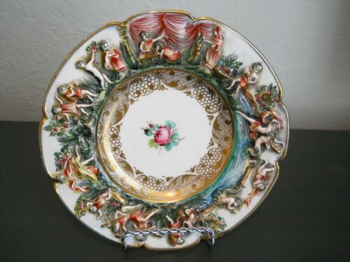 Vintage Capodimonte Porcelain 7" Plate Cherubs Rose Gold Lace Crown w C mark