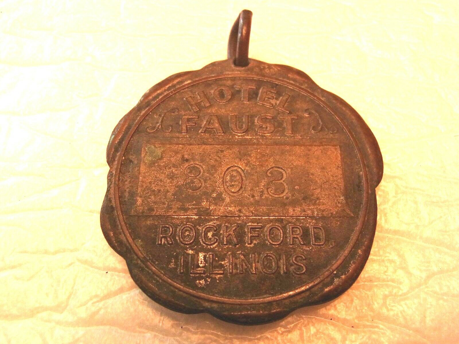VINTAGE HOTEL FAUST HEAVY METAL KEY FOB ROCKFORD ILLINOIS ROOM 803 W/BUILDING