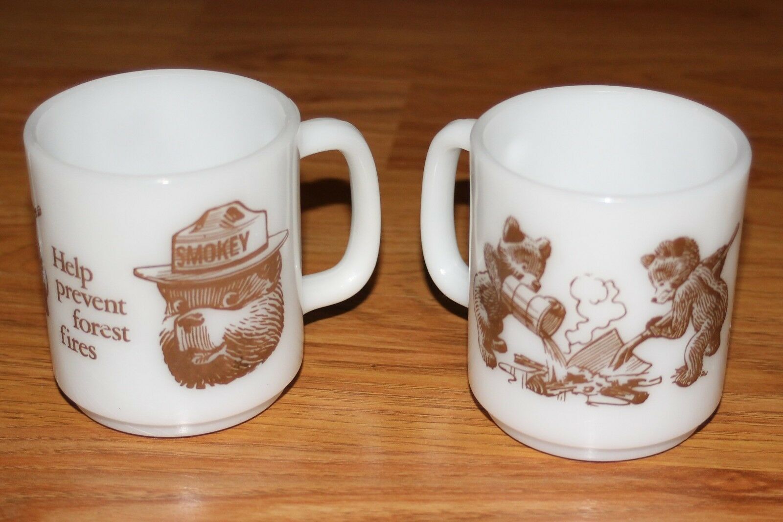 2 VINTAGE SMOKEY BEAR MILK GLASS COFFEE MUGS