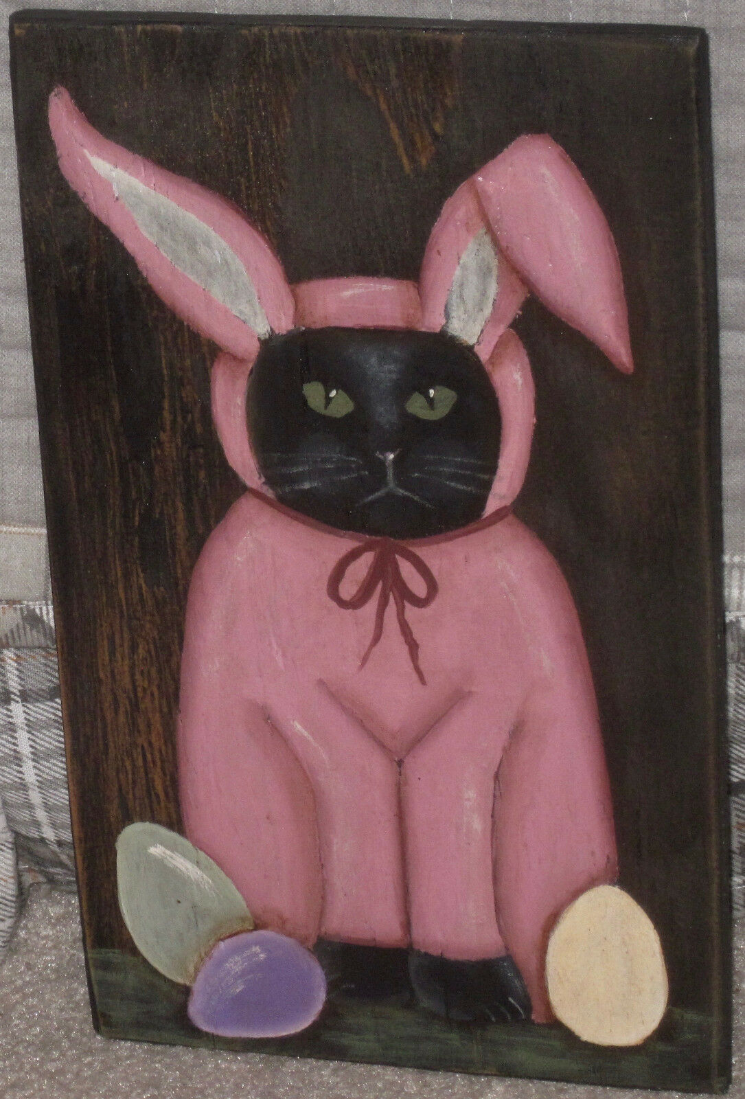 *~*PRIMITIVE*~* HP FOLK ART EASTER BLACK CAT * BUNNY * COLORED EGGS *~* BOARD