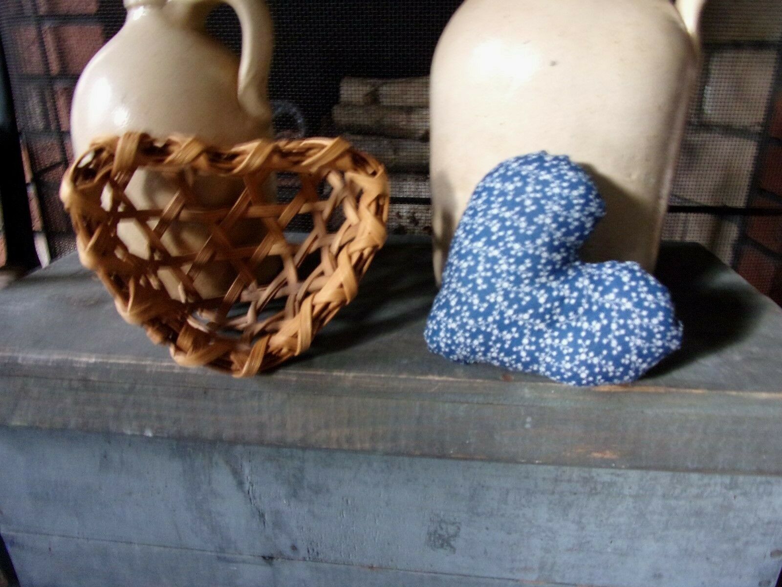 small vinatge cheese basket and early antique blue calico heart!!!!