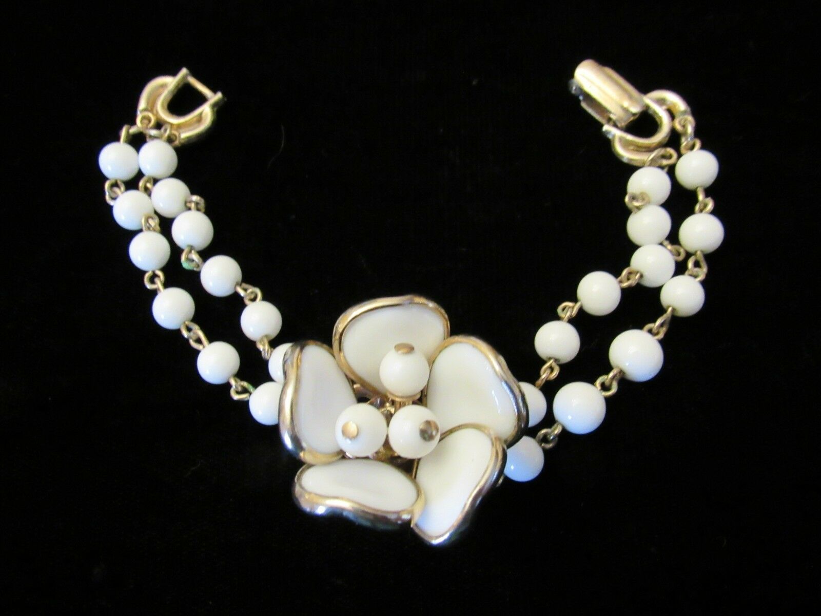 Vintage Milk Glass Flower and Bead Bracelet High Relief Bridal Unsigned Trifari?