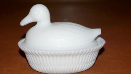 Title (ebay affiliate link): Vintage 5 1/2" White Milk Glass Duck On Nest Candy Nut Butter Bowl Rare
