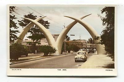 Mombassa - Tusk Arch, road & traffic - 1950''s or 60''s Kenya real photo postcard