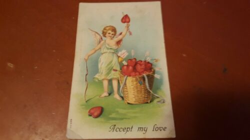Valentine Day Greeting c1909 Cupid Angel with Arrow, red heart, vintage postcard