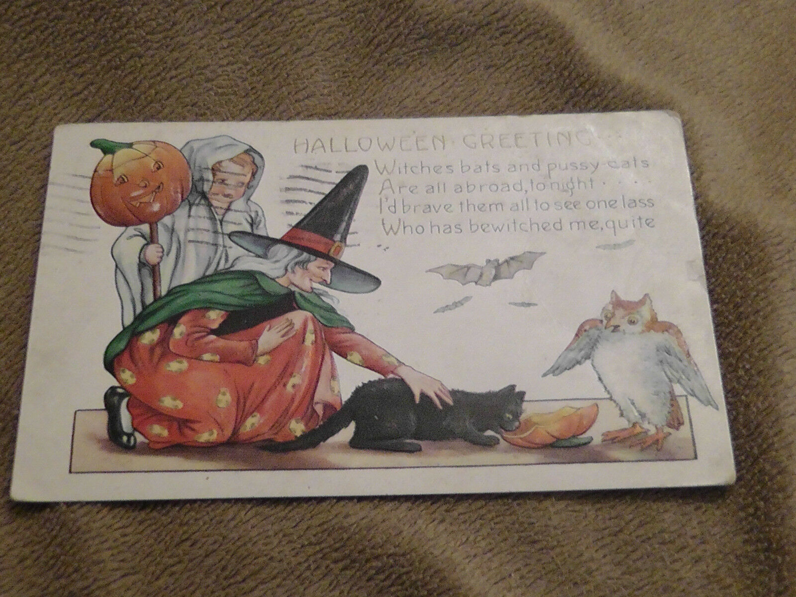 Title (ebay affiliate link): Vintage Postcard Halloween Owl Black Cat Candles Witch Pumpkin Bat