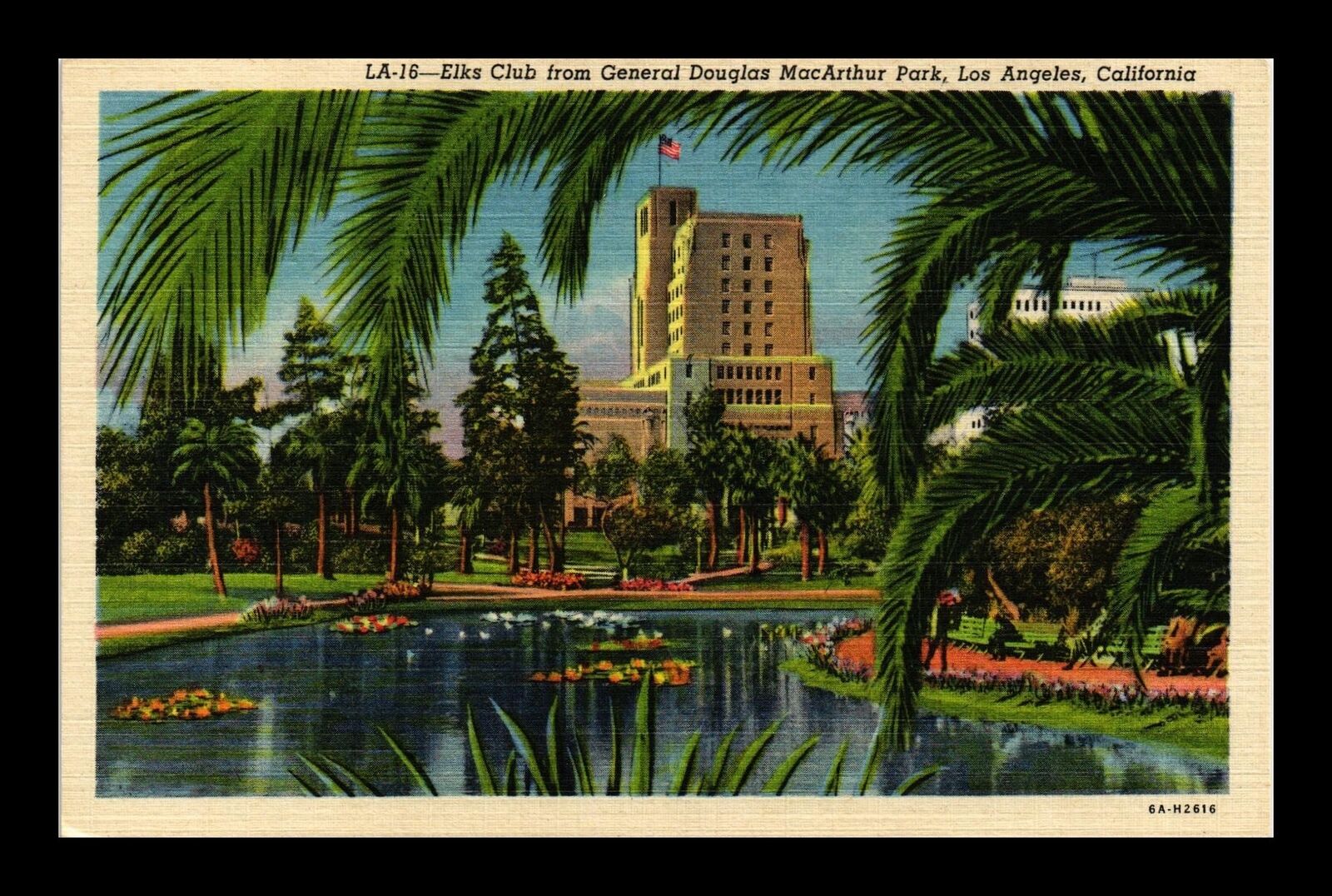 DR JIM STAMPS US ELKS CLUB MACARTHUR PARK LOS ANGELES LINEN POSTCARD