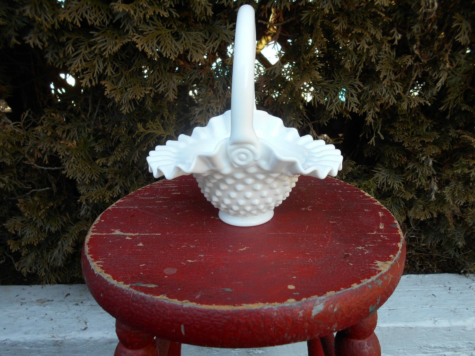 Title (ebay affiliate link): White Fenton Hobnail Milk Glass Ruffled Edge Basket with Handle.