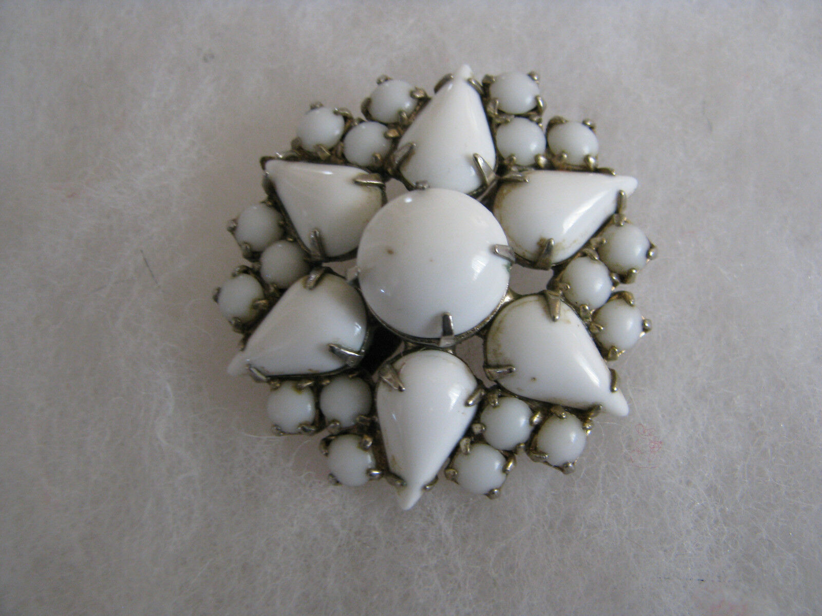 Title (ebay affiliate link): VINTAGE WHITE MILK GLASS STAR SHAPED SILVERTONE BROOCH PIN