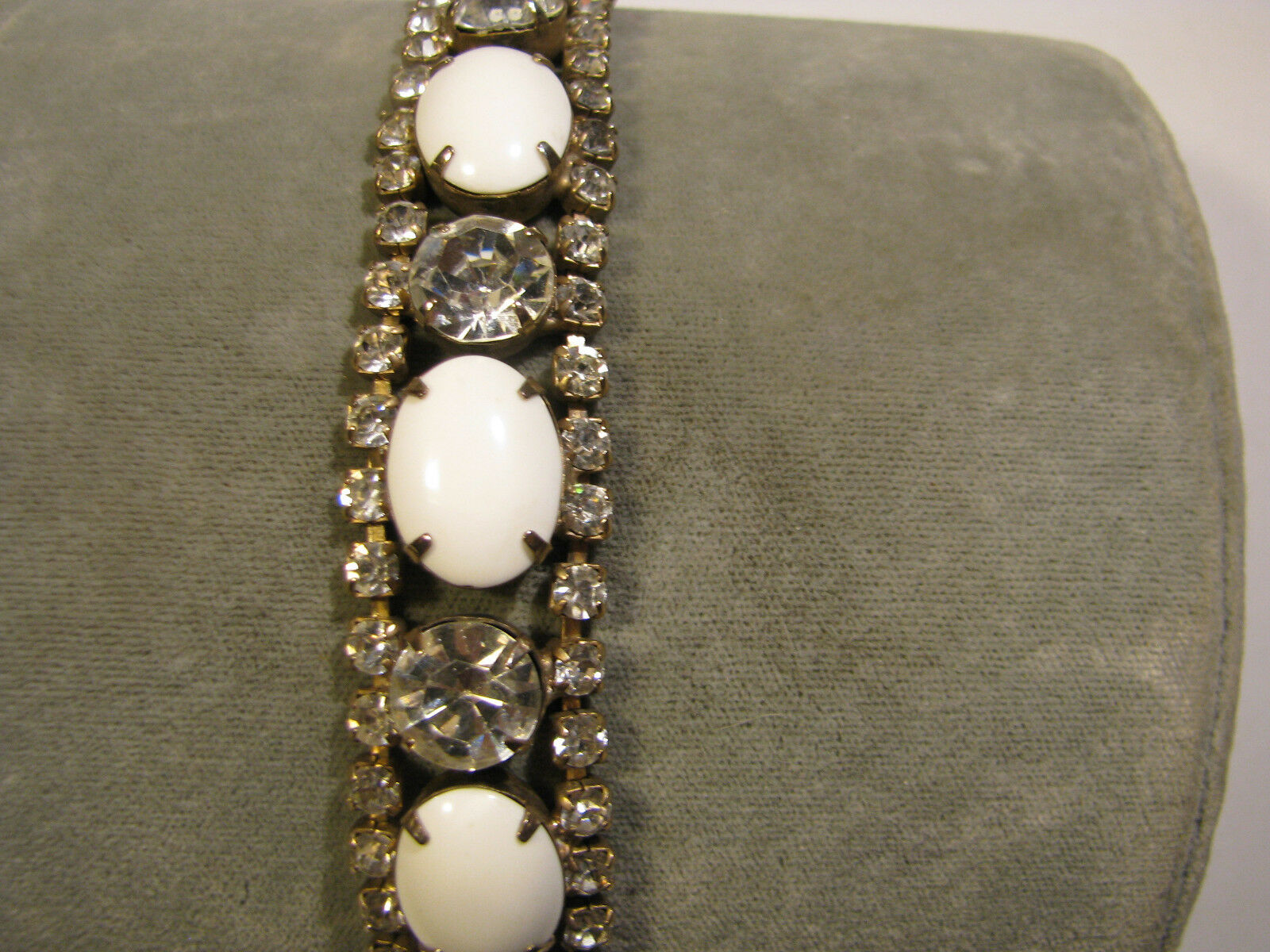 Title (ebay affiliate link): VINTAGE ESTATE FIND WHITE MILK GLASS CLEAR RHINESTONES SILVERTONE 7" BRACELET
