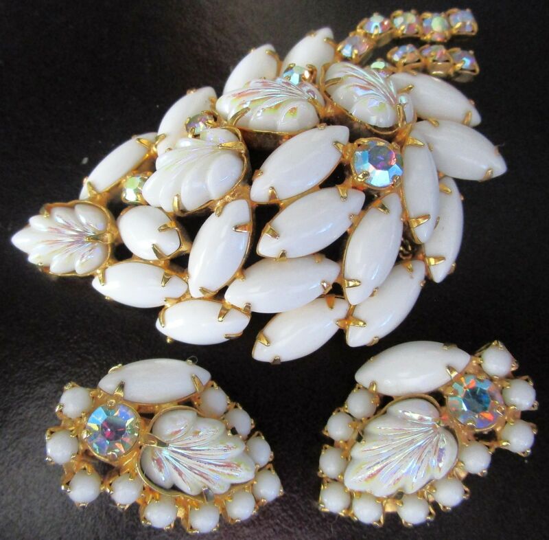 Title (ebay affiliate link): White Milk Glass Molded Leaves AB Rhinestone Vintage Pin Earring Set