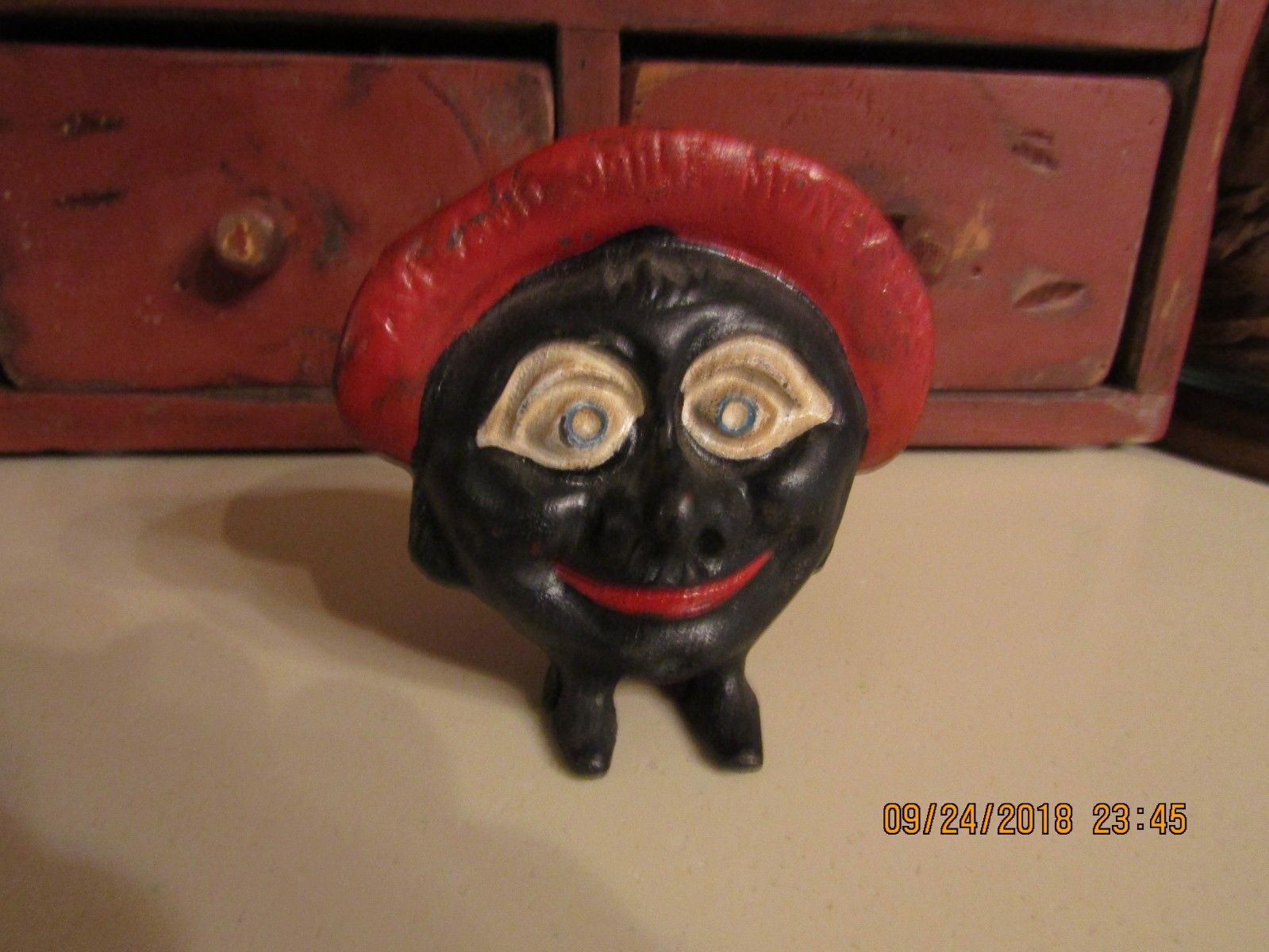 Title (ebay affiliate link): VINTAGE BLACK AMERICANA SAVE & SMILE MONEY BOX - CAST IRON BANK