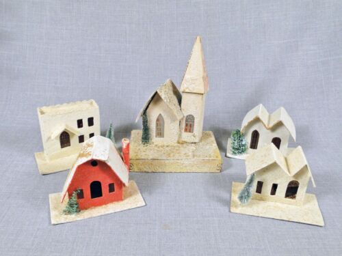 Title (ebay affiliate link): 5 Vintage Christmas Cardboard Houses Putz Display Houses Barn and Church