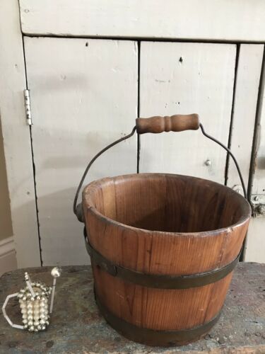Title (ebay affiliate link): Small Old Vintage Wooden Staved Bucket w/ Bail Handle Metal Bands