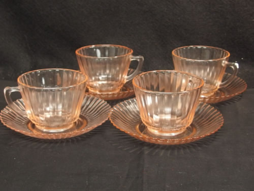 Title (ebay affiliate link): Set of 4 Ribbed Pink Depression Glass Cups & Saucers