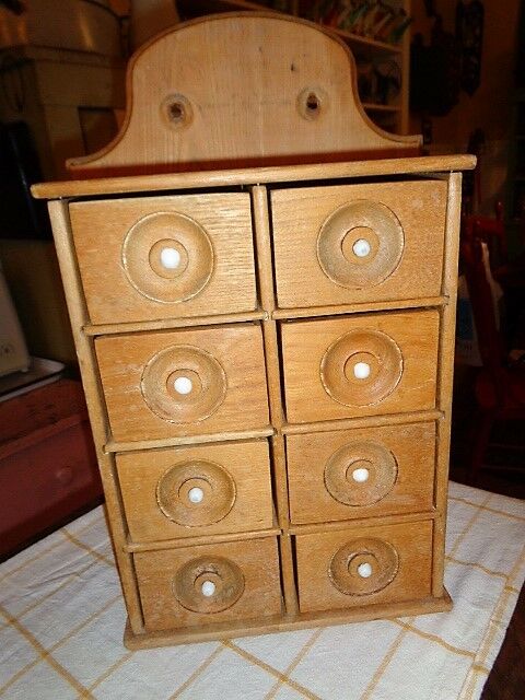Title (ebay affiliate link): Antique 8 Drawer Wood Spice Apothacary Cabinet Box w/Porcelain Button Knobs