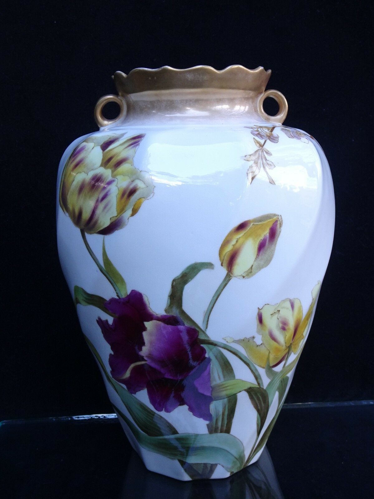 SUPERB ANTIQUE GEORGE JONES CRESCENT CHINA HAND-PAINTED VASE W/ TULIPS
