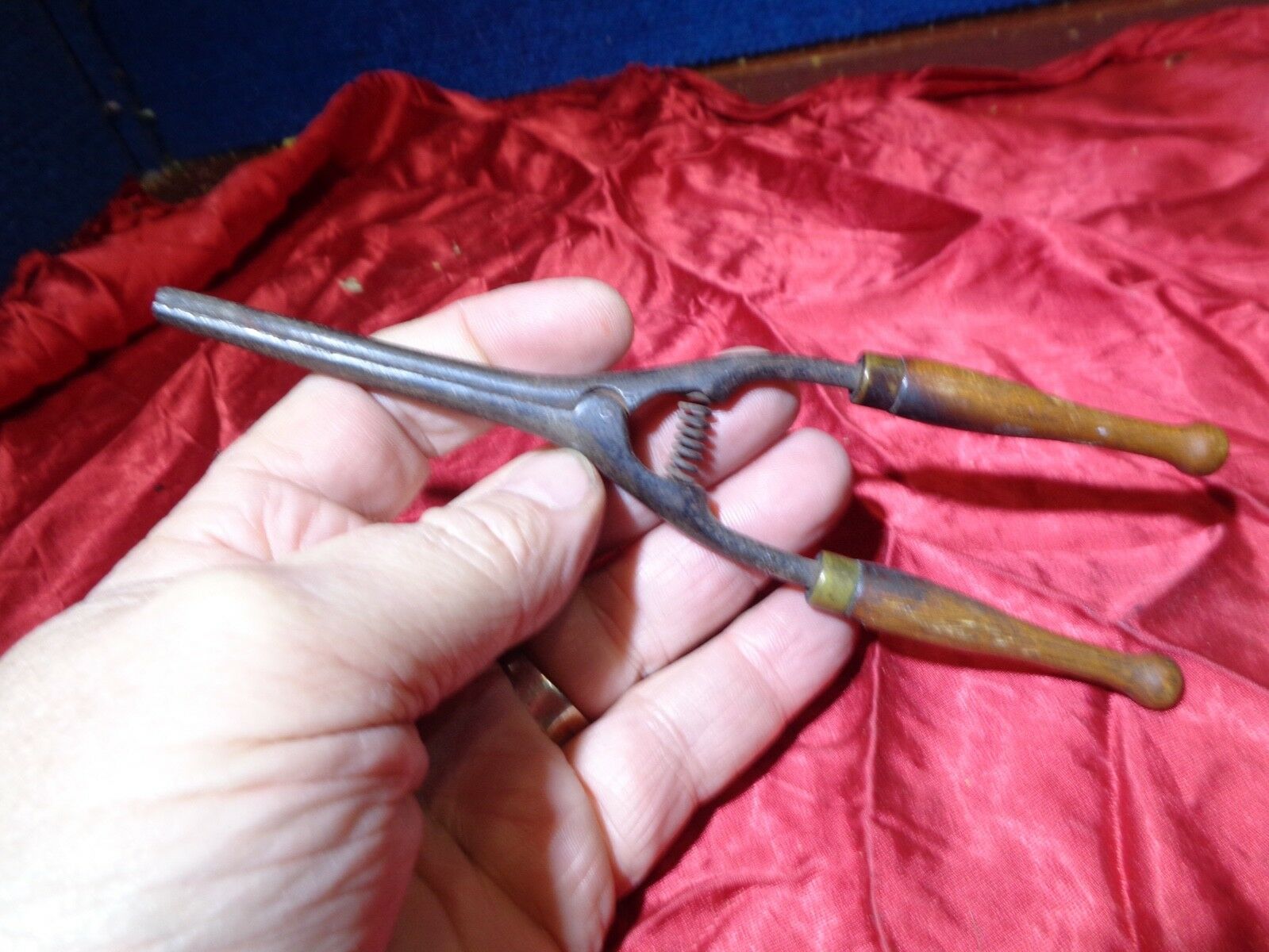 PRIMITIVE MINIATURE CURLING IRON HAIR CURLER WITH WOOD HANDLES