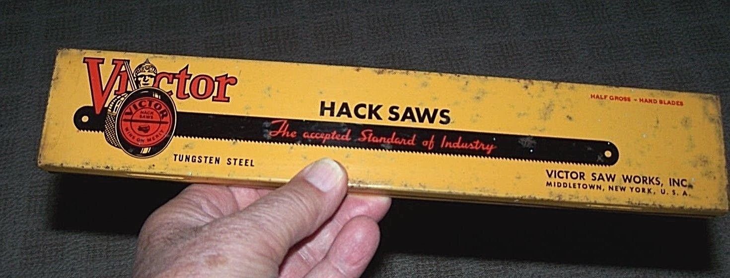 Title (ebay affiliate link): Old 1937 Victor Hack Saw Tin Advertising Box 1/2 Gross 12 5/8" x 2 3/8" x 3/4"