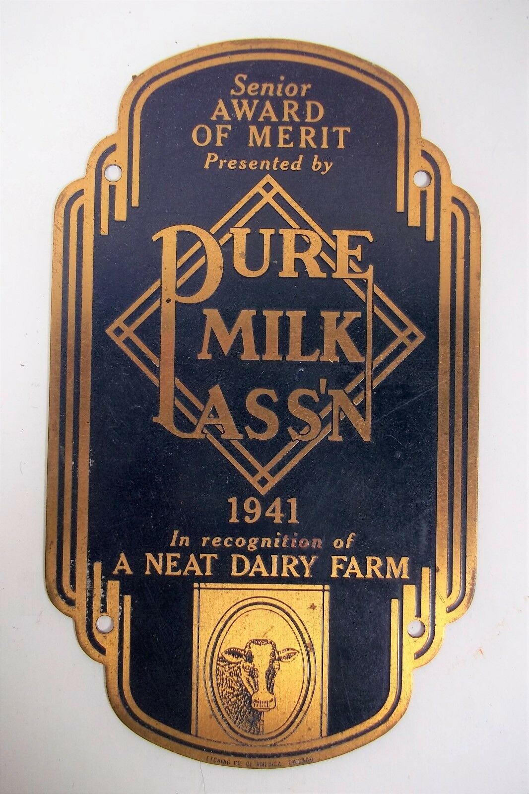 vtg 1941 DAIRY FARM AWARD Milk brass plaque sign badge Cow advertising