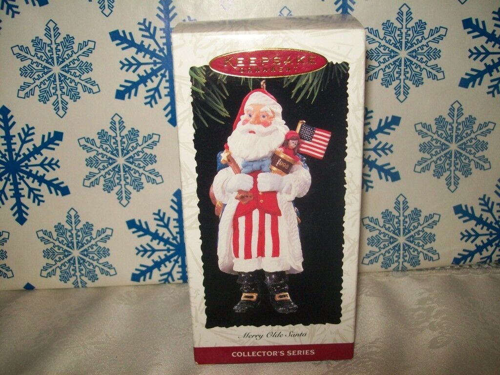 Title (ebay affiliate link): HALLMARK MERRY OLDE SANTA #7 SERIES 1996 CHRISTMAS KEEPSAKE ORNAMENTS USA FLAG