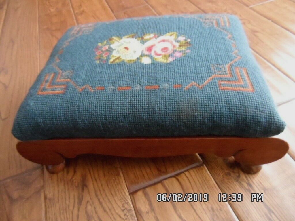 Title (ebay affiliate link): Vintage Antique Foot Stool Floral Blue/Green Needlepoint Wood Paine Furniture