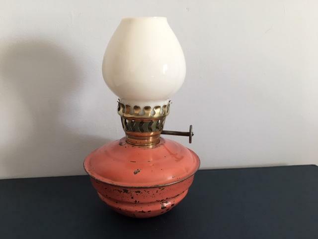 Title (ebay affiliate link): Vintage dusky pink enamel + brass Kelly / Nursery Lamp with milk glass lampshade