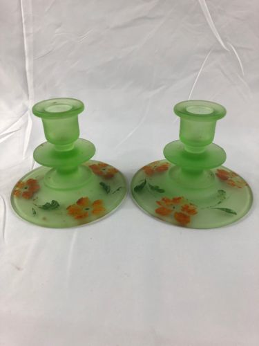 Title (ebay affiliate link): Set 2 Vintage Glass Green Flower Painted Trim Candle Stick Holder