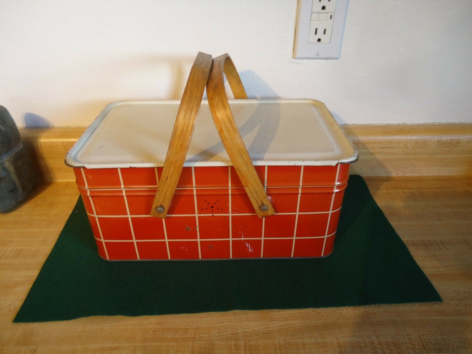 Title (ebay affiliate link): Vintage Salerno Cookies - Cracker Tin Litho Country Picnic Basket (Wood Handles)