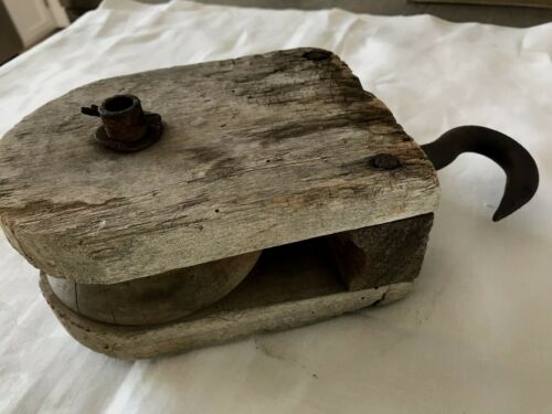 Title (ebay affiliate link): Antique Wooden Pulley with Cast Hook Rustic Farm Decor Cabin Ships Barn (CL)