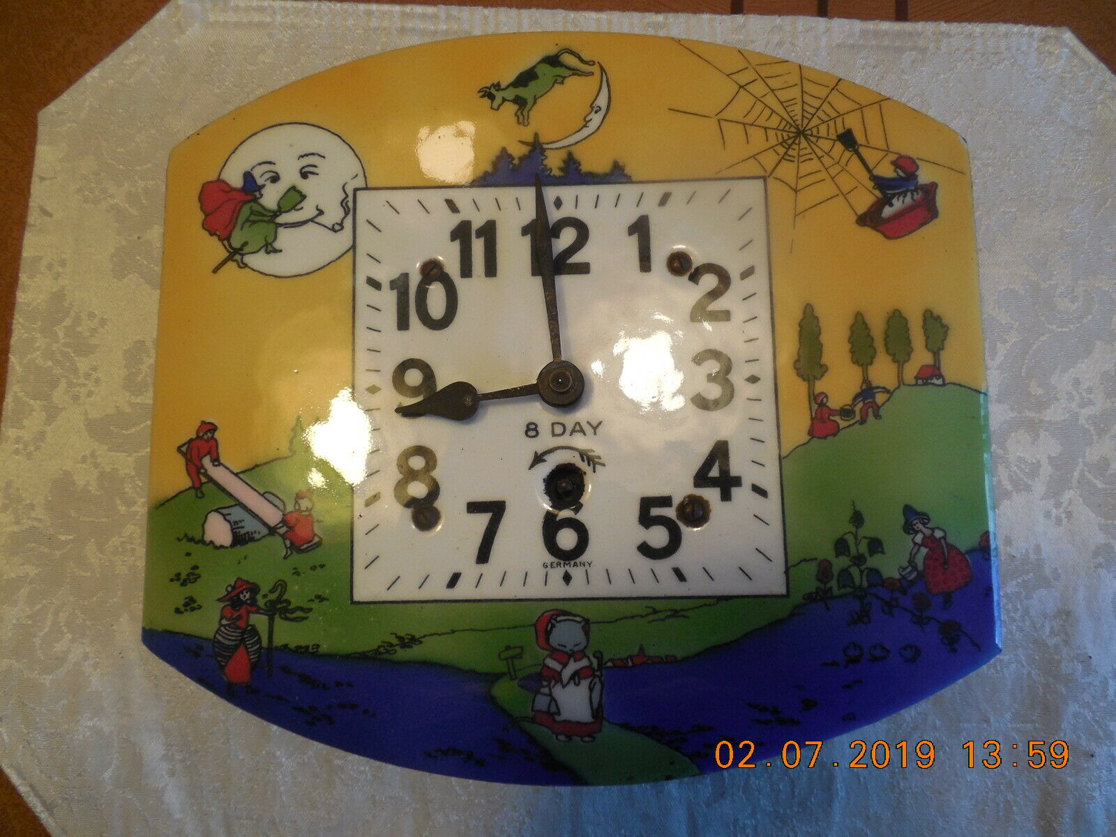 Title (ebay affiliate link): GERMAN ENAMEL CLOCK WITH NURSERY RHYME CHARACTERS...NO KEY & NOT RUNNING