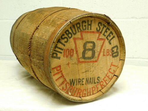 Title (ebay affiliate link): Vintage 18" x 10" PITTSBURGH STEEL CO. No 8 100 Lb. nail wooden barrel !!!!