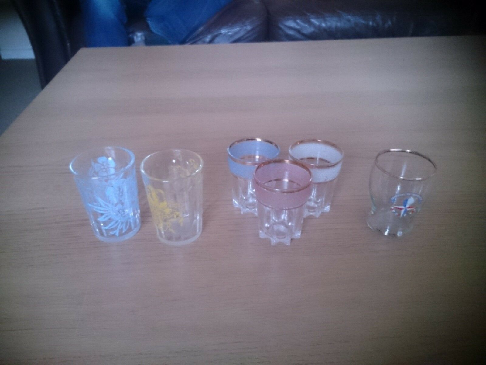 Title (ebay affiliate link): Mixture 6 retro shot glasses. 3 frosted rings. 2 flowered. 1 festival of Britian