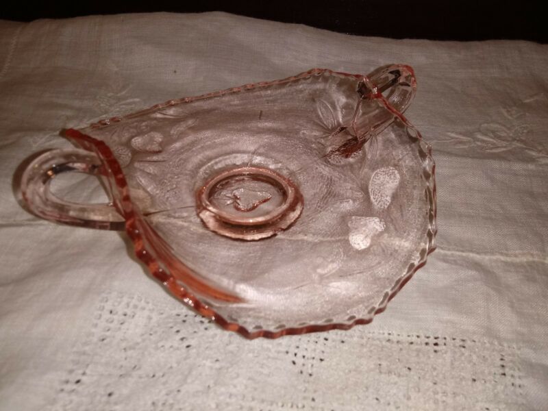 VINTAGE STRAWBERRY PATTERNED PINK DEPRESSION GLASS HANDLED BON BON DISH