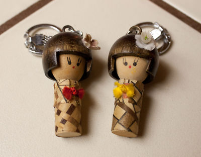 Title (ebay affiliate link): Vintage inlaid wood Yosegi Kokeshi keychains USA SELLER
