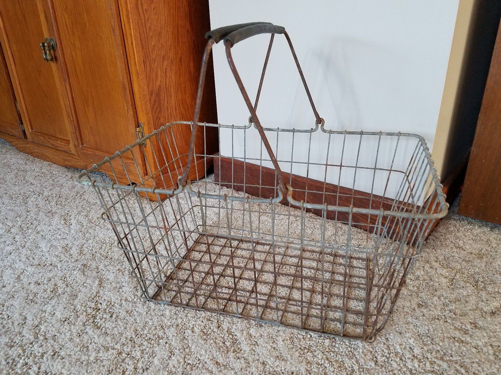 Vintage LARGE grocery shopping wire basket padded handles primitive metal farm
