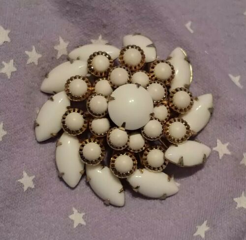 1940s Vintage White Milk Glass Tiered Brooch Pin Prong Set Pinwheel Rivited
