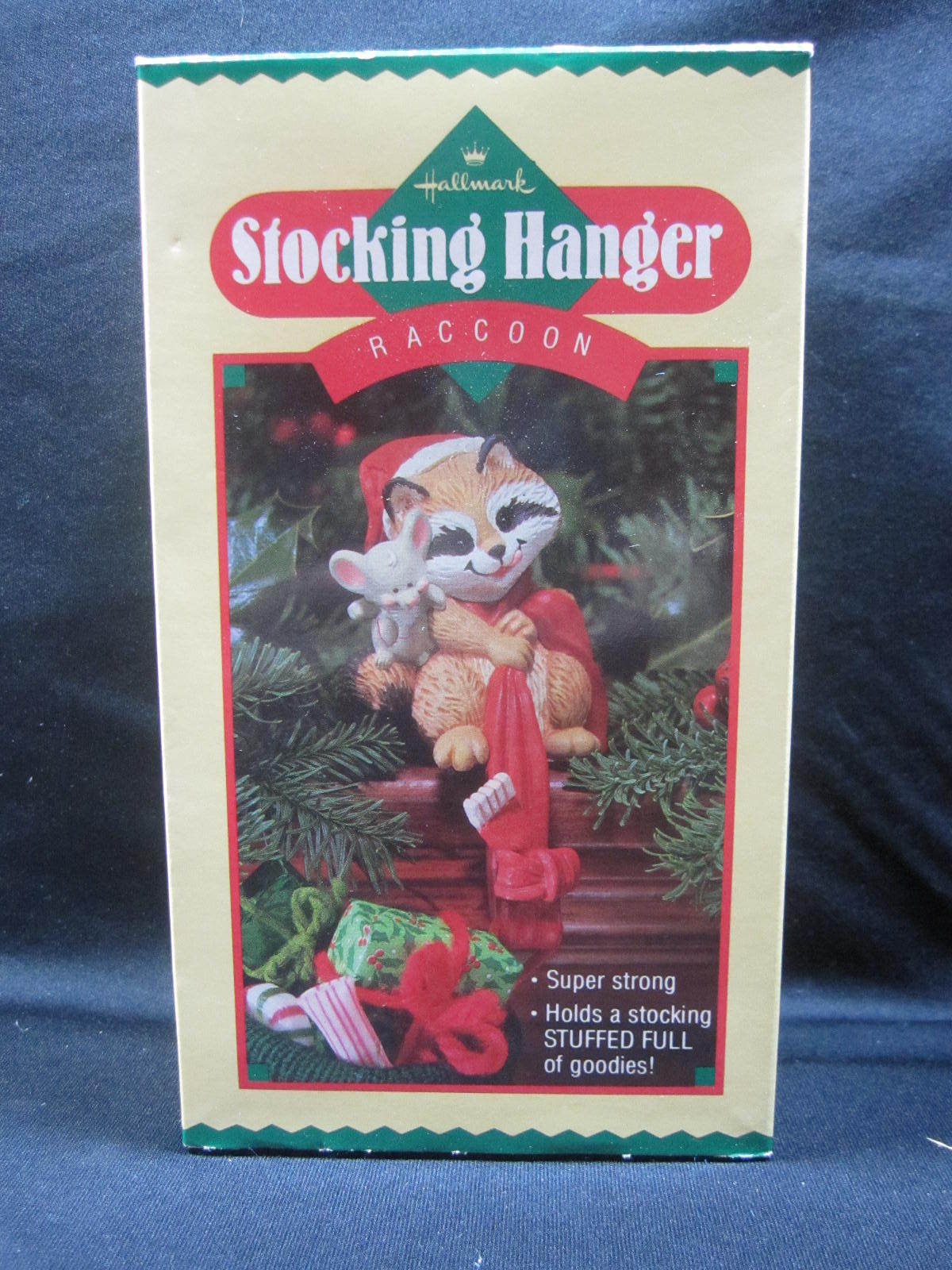 Title (ebay affiliate link): Raccoon - Hallmark Stocking Hanger - Mouse/Santa Hat/Scarf 1984