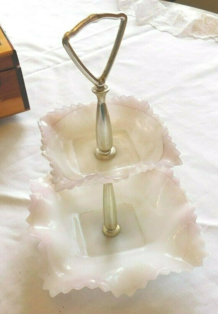 Vintage two tier candy mint dish,,,white milk glass with pink accents