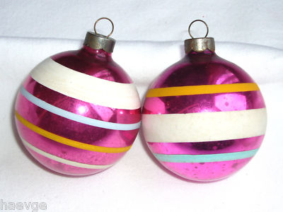 Title (ebay affiliate link): 2 VTG PiNK SHiNy BRiTe ~ WaR eRa XMaS STRiPe oRNaMeNTS
