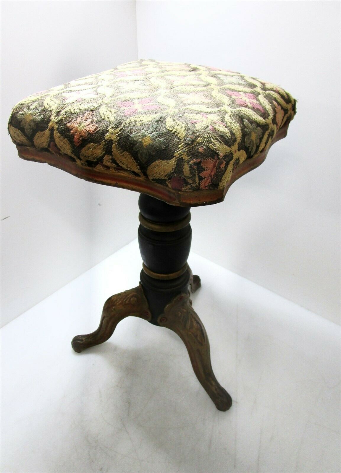 Antique Iron Footed Piano Stool Swivel Ornate Floral Upholstery