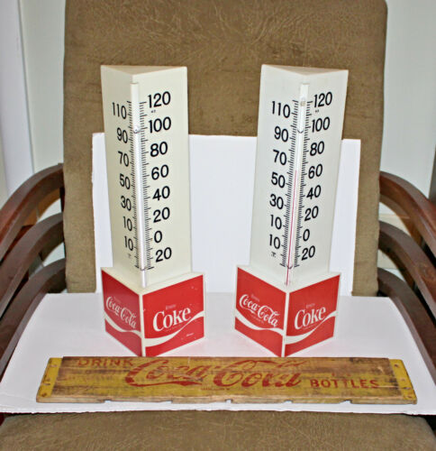 Title (ebay affiliate link): 2 Vintage Coca Cola Triangle Standing Thermometers & Coca Cola Wood Case Side