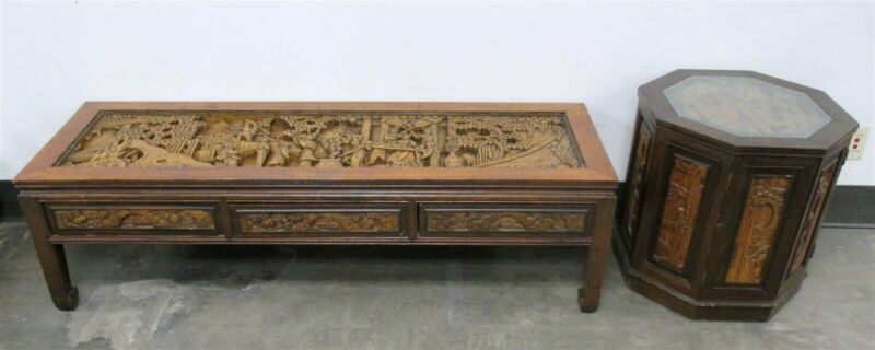 Vintage Hand-Carved Asian-Style Two-Piece Wooden Coffee Table Set