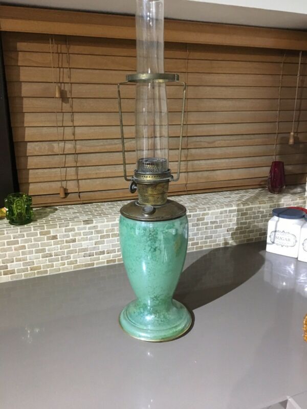 Title (ebay affiliate link): Antique green glass oil burner lamp with glass chimney