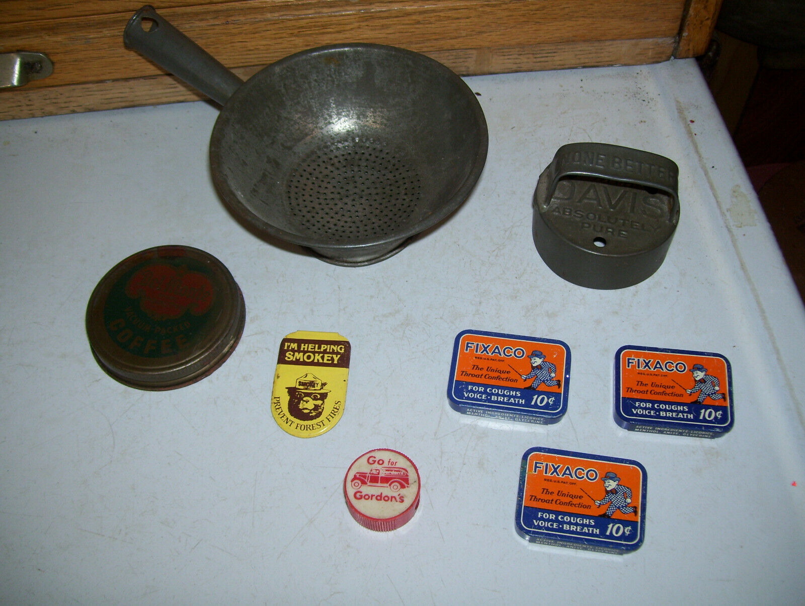 Title (ebay affiliate link): 8 OLD TINS LIKE 3 FIXACO COUGH TINS-GORDON''S- NICE STRAINER-DAVIS BISCUIT CUTTER